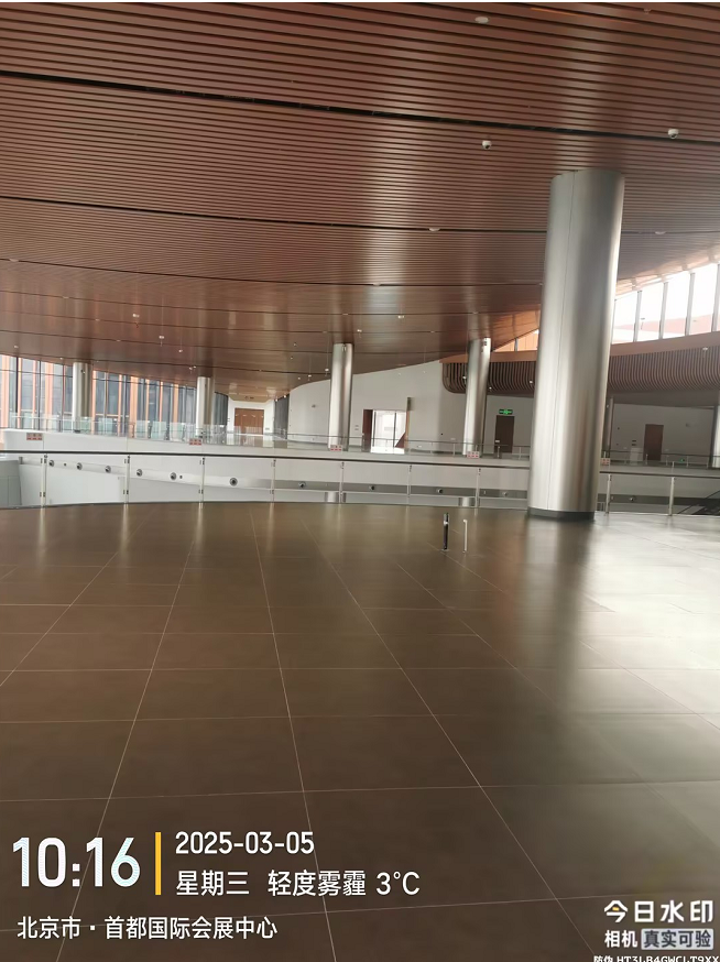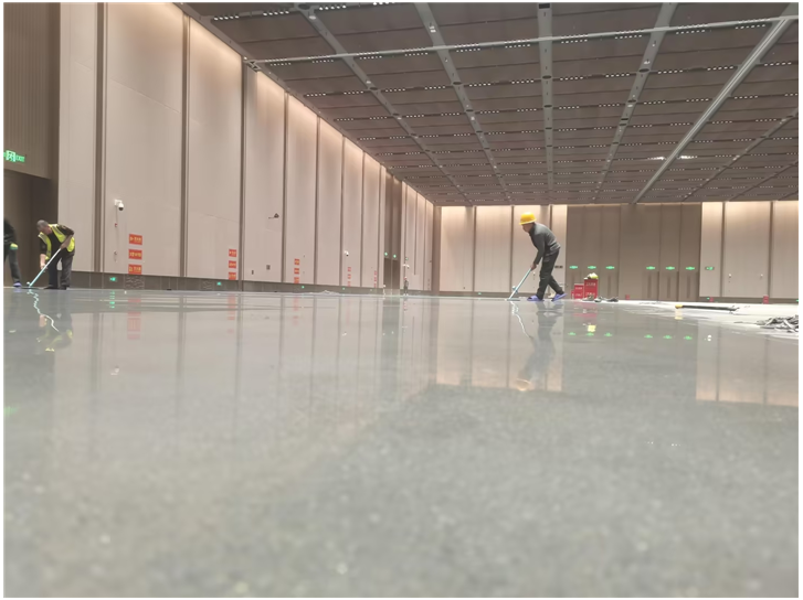 天津市东为建设科技有限公司(东为建设)承建全场馆地坪建设,新国展二期对地坪的要求堪称 “会展业天花板”:作为国际展会主场馆,需承受短期集中荷载与长期高频使用的双重考验;作为京津冀协同发展的重点工程,需满足 - 20℃至 40℃极端温差下的稳定性;作为绿色建筑示范项目,需实现 “零甲醛、高耐用”的环保标准,所以东为建设选择钢纤维混凝土固化地坪进行施工,通过 “钢纤维 + 固化剂” 的复合工艺实现了用料少与寿命长的平衡,同时能够降低后期的翻新成本。